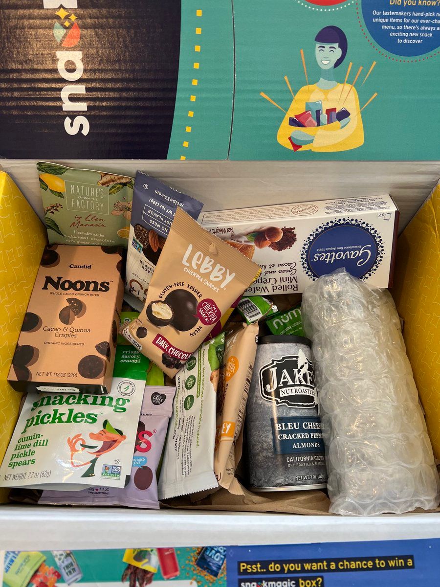 Alt text: a box of snacks from snackmagic. There’s some almonds and snacking pickles and chocolate things in here. Stuff my kid wouldn’t eat, which I’m happy about.